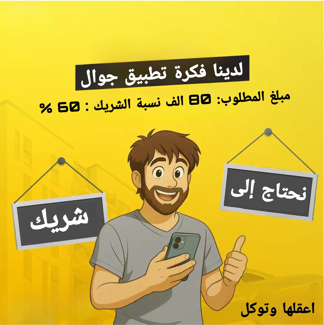 لدينا فكرة تطبيق جوال مختص في مجال السيارات وملحقاته المشروع جدا جميل وتم تطويره كفكرة ولشكل ولان نحتاج الى شريك دائم المبلغ المطلوب 80 ألف ونسبة الشريك 60 في مائة مكتبنا في الرياض باقي التفاصيل عند التواصل 0537648118 اعقلها وتوكل